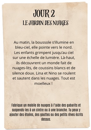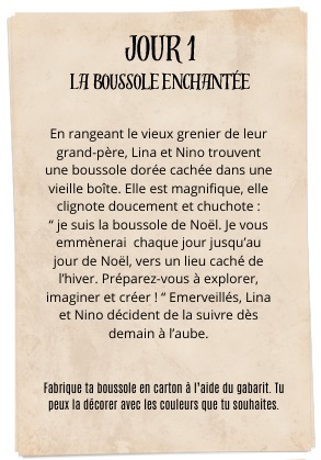 Tout commence un matin d’hiver. En rangeant le grenier de leur grand-père, Lina et Nino découvrent une mystérieuse boussole dorée. Mais cette boussole-là ne montre pas le nord… elle montre le chemin du cœur. Guidés par sa lumière, les deux enfants partent pour un voyage extraordinaire : ils traversent le Jardin des Nuages, le Marché des Étoiles, la Forêt des Secrets ou encore le Bal des Flocons. Chaque jour de décembre, un nouveau lieu, une émotion, une rencontre. Et à chaque étape, une petite activité créative à réaliser, simple, douce et pleine de sens.