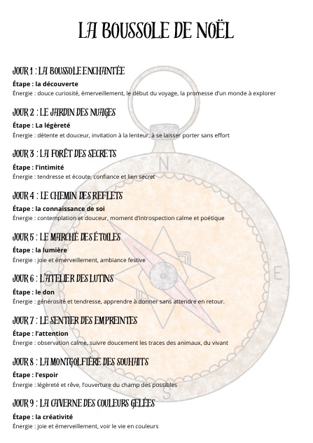 Décembre approche, et avec lui, le doux frisson de l’attente… Et si, cette année, on troquait les petits chocolats contre une aventure poétique, sensorielle et pleine de tendresse ? Bienvenue dans La Boussole de Noël, un calendrier de l’Avent pas comme les autres — un voyage imaginaire à vivre en famille, jour après jour. —